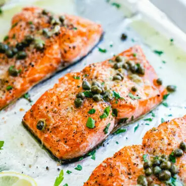 - 仕える: サーモンが焼き上がったら、残りのレモンスライスからレモン汁を絞ります。サーモンの各切れ端にバターソースをスプーンで注ぎます。細かく刻んだパセリまたはチャイブを飾ります。