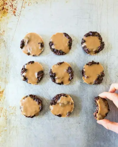 これらのダークチョコレートの焼かないクッキーは、タヒニ (ゴマペースト)、メープルシロップ、シーソルトを特徴としています。塩味の甘い組み合わせは、夢中になってしまいます。オーツ麦とココナッツオイルで作ったのでパーティーで出しましたが、あっという間になくなってしまいます!