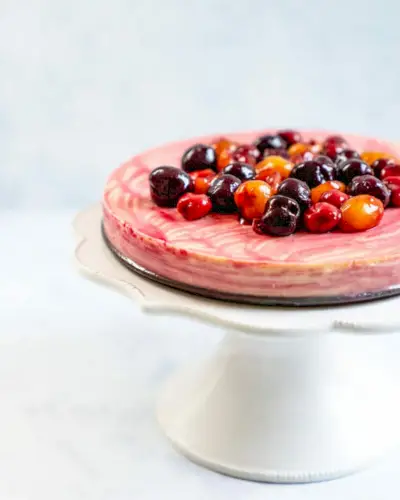 このチェリーチーズケーキは、グルテンフリーでクリーミーなデザートとして濃厚な風味を持っています。ここでは、伝統的なクリームやコンデンスミルクの代わりに、ギリシャヨーグルトがクリーミーさを加えるのに役立ちます。いわば、ケーキの飾り?クラストレスです!皮のないチーズケーキはカロリーも抑えられます。中身がクリーミーなので、食べ忘れることもありません。私たちのお気に入りのグルテンフリーデザートの一つです。