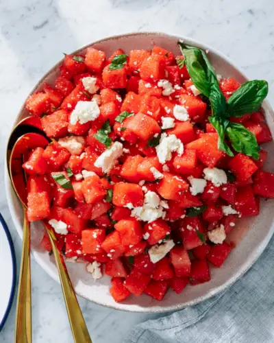 夏メロンの最高の使い方のひとつ、スイカのバジルサラダをご紹介します。甘いメロンと塩気のあるチーズの古典的な組み合わせは、バジルを加えることでさらに完璧になります。フレッシュでハーブのような余韻があり、一口食べるごとに魅力的な味わいになります。これ 夏のサラダ おもてなしに最適で、パーティーや屋外での気ままな夜のテーブルに置くのが大好きです。