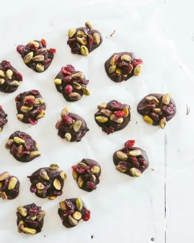 クランベリークラスターは楽しくて簡単なおやつです。ダークチョコレートを溶かし、ドライクランベリーとピスタチオを加え、冷蔵庫で冷やします。結果はそうです それで 特に高品質のダークチョコレートとの組み合わせが美味しいです。ピスタチオの赤と緑のコントラストがあり、見た目も楽しくてお祭り気分です。