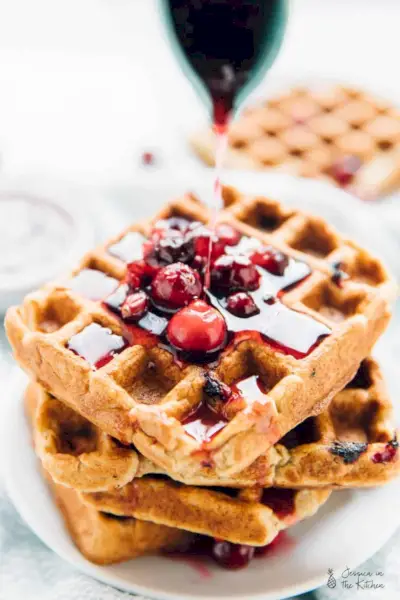 写真クレジット: ジェシカインザキッチン.comオレンジクランベリーワッフル クランベリーコンポート添え