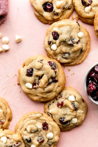 ふんわり焼き上げたホワイトチョコチップクランベリークッキーは、もっちりとした食感が絶品!甘いホワイトチョコレートと酸味のあるドライクランベリーの古典的な組み合わせが主役です。経由 サリーのパン作り中毒