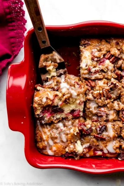 ディナーやブランチにぴったりのクランベリーのレシピをお探しですか?このクランベリー ピーカン ケーキは柔らかくバターのような味わいで、一口ごとにブラウンシュガー シナモン ピーカン クランブルがかかっています。経由 サリーのパン作り中毒