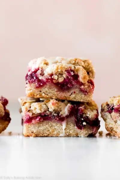 これらのクランベリー クランブル パイ バーは、バターのようなフレーク状のショートブレッドの皮、ジャムのようなクランベリーの詰め物、そして砕けやすいアーモンドのトッピングを組み合わせています。食べやすく、持ち運びも簡単なので、パーティーにも最適です。経由 サリーのパン作り中毒