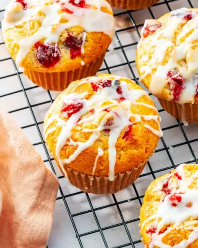 私たちのお気に入りリストのトップに躍り出たクランベリーのレシピ、クランベリー オレンジ マフィンをご紹介します。柔らかくふわふわで、ピリッとしたオレンジの皮と甘いタルトのクランベリーのはじける香りがします。一番いいところは?甘いオレンジのアイシンググレーズが、ベリーのバランスを整えるために、ちょうどいい甘さのアクセントをもたらします。
