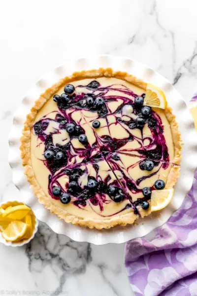 誰もが驚くような素晴らしいブルーベリーのレシピをご紹介します。この冷たくてクリーミーでさわやかなレモンブルーベリータルトは、シンプルなレモンフィリング、サクサクのショートブレッド生地、そして美しい自家製ブルーベリーソースの渦巻きが特徴です。たった10種類の材料で完成!経由 サリーのパン作り中毒