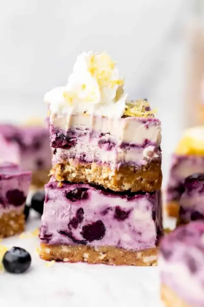 レモン、ブルーベリー、チーズケーキ?まさに天国のような試合です!これらのクリーミーなレモン チーズケーキ バーにはブルーベリーがちりばめられ、カリカリのグラハム クラッカーの皮が付いています。まさに完璧!経由 健康に良いものすべて