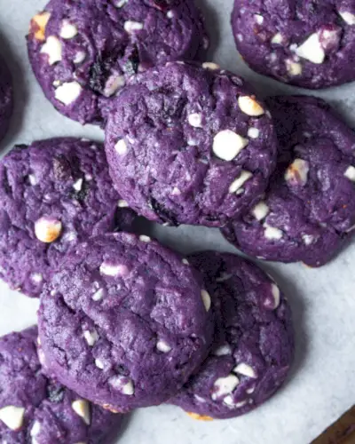 これらのクッキーは自然な色で、ブルーベリーがぎっしり詰まっており、中は柔らかく、端はサクサクしています。口の中でとろけて、ホワイトチョコレートがちりばめられています。ブルーベリーマフィンとチョコチップクッキーが結婚したようなものです。経由 ジャスティン・スナック