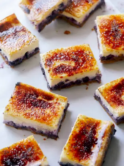 チーズケーキやクレームブリュレは好きですか?このブルーベリーデザートは、これらの定番デザートをバー状にマッシュアップしたものです。ブルーベリーの層、クリーミーでピリッとしたチーズケーキ、カリカリのブリュレシュガークラストが入っています。経由 スプーン・フォーク・ベーコン