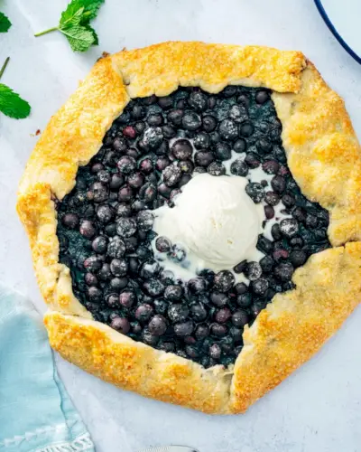 ブルーベリーガレットをぜひお試しください!このフリーフォームのブルーベリータルトは、特別な器具を使わずにとても簡単に作ることができ、その風味はこの世のものとは思えません。フィリングには甘いタルトベリーがたっぷりと詰め込まれており、十分な甘みがあり、レモンの皮とシナモンのふりかけで風味を高めています。すべてが金色のフレーク状のパイ生地に包まれており、ベリーの魅力的なフレームを形成しています。