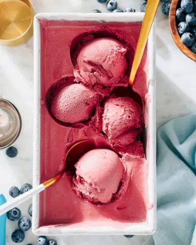 自家製ブルーベリーアイスクリームをぜひお試しください!甘くてクリーミーで、純粋なフルーツの風味があり、この地味なベリーの高級バージョンのような味わいです。自家製バッチを混ぜ合わせれば、冷凍庫で何週間もクリーミーな状態が保たれます。鮮やかなフクシアカラーが際立ち、夏の夜にぴったりのスイーツです。