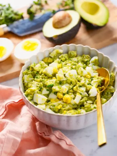 マヨネーズの代わりにアボカドを加えると、刻んだゆで卵にぴったりのクリーミーな緑色のソースができあがります。新鮮なチャイブとディジョンマスタードのピリッとした風味と混ぜると、まさに絶品です。 喜び の ランチのアイデア または簡単なスナック。私たちの子供たちもそれを気に入っています。それはここでの大きな勝利です!
