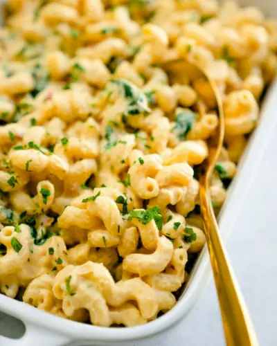 この簡単なマカロニ&チーズのレシピは、手早く簡単に食べられるだけでなく、健康的なアレンジも加えられるため、パスタディナーのトップアイデアの 1 つです。これはコンロで作り、最後にギリシャヨーグルトを混ぜてクリーミーさとタンパク質を加えます。新鮮なほうれん草はすべての栄養素を加えるために優しくしおれ、ターメリックはわずかな免疫力の向上と余分な色を与えます。