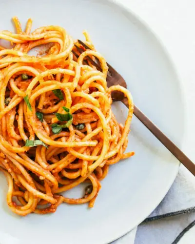クリーミーなマリナラソースを添えたこのヴィーガンスパゲッティは、にんにく、エシャロット、ケッパーの風味が絶妙な味わいのソースです。 カシュークリーム ビーガンスパゲッティのレシピで最大限の旨味を引き出すために。その とても良い とても簡単に作れるパスタディナーのアイデアも。