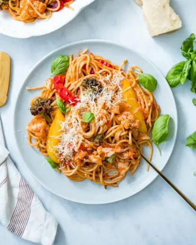 どれだけ健康な人でも、 簡単なディナーのアイデア 私たちはレパートリーに持っていますが、常に別のレパートリーを必要としています。良いものをたくさん摂取するための最新のアイデアは、この野菜パスタです。居心地の良いホッとする料理と野菜たっぷりの健康的な食事を組み合わせたもので、ローストした野菜と鮮やかなマリナラとパルメザン チーズを組み合わせています。