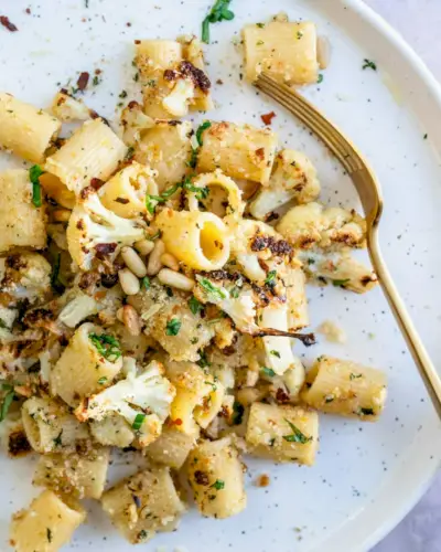 素晴らしいパスタディナーのアイデアをご紹介します。ローストカリフラワーパスタです。柔らかくてキャラメリゼされてます ローストカリフラワー : 甘く、レモンのような、ガーリックのような香り。次に、アルデンテのパスタをパルメザンチーズの簡単なパンソースで覆います。カリカリのバジルをトッピングして完成です パンくずリスト そして トーストした松の実 そしてそれは風味の爆発です。