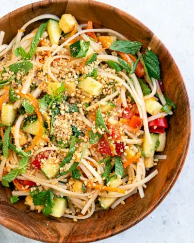 フレーバーの爆発と言えば、それが本当の意味です。このヌードルボウルのレシピには、春巻きの優れた点がすべてボウル形式で詰め込まれています。シャキシャキした野菜、柔らかい麺、カリカリに砕いたピーナッツのコントラストと、バジル、コリアンダー、ミントのトリオによるハーブのパンチがあります。ジンジャーガーリックライムソースが生姜のような柑橘系の風味を全体に注入し、それが私たちのソースと混ざり合います。 簡単な豆腐のマリネ 。