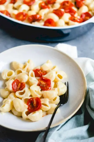 この簡単なパスタディナーレシピのもう 1 つの優れた点は、焼く時間が必要ないことです。マカロニ アンド チーズを作り、ローストトマトをトッピングして食べるだけです。