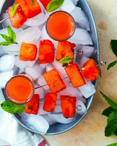 独創的な夏前菜、スイカのテキーラ串をご紹介します。はい、スイカとテキーラがカクテルに組み合わされているのをよく見かけます(そして、誰がそのカクテルを断ることができるでしょう) スイカデイジー ?)。でも、スイカの角に少し振りかけると、絶対に美味しいですよ 天才 !アルコールは飲みたくないですか?スイカライム串を作るのにスキップしてください。それも同じくらい美味しいです。