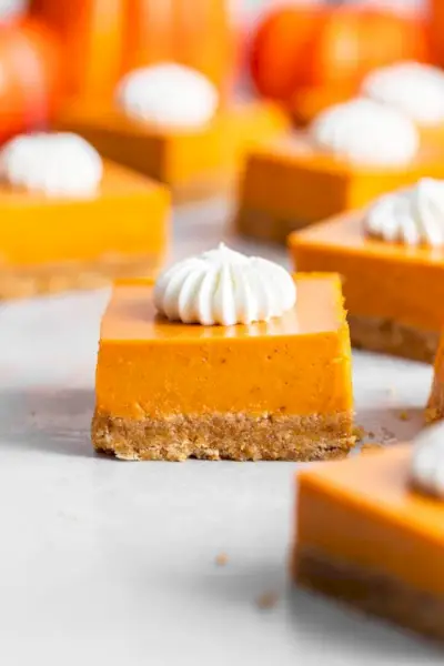 誰もが気に入る見事なカボチャのデザートをお望みですか?かぼちゃのシュトロイゼルバーをぜひお試しください!ジンジャースナップの皮、クリーミーなカボチャのフィリング、黒糖シュトロイゼルのトッピングが入っています。バニラアイシングをかけて、簡単に作って食べられます。経由 サリーのパン作り中毒