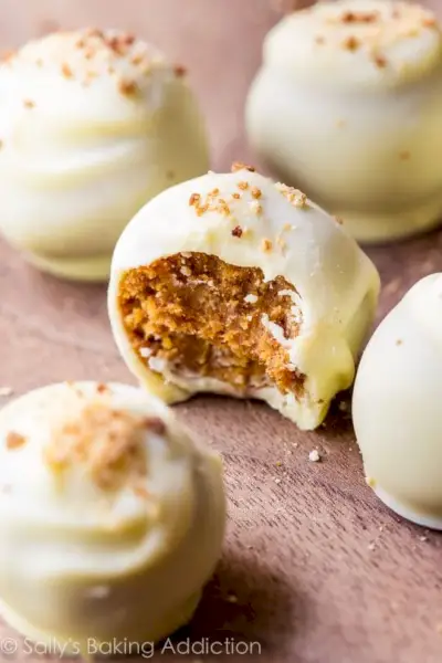 また素晴らしいカボチャのデザートはありますか?パンプキンスパイストリュフを試してみよう!本物のかぼちゃのピューレで作られているので、贅沢でありながら驚くほど簡単に調理できます。ホワイトまたはダークチョコレートでコーティングし、グラハムクラッカーの粉を振りかけます。経由 サリーのパン作り中毒