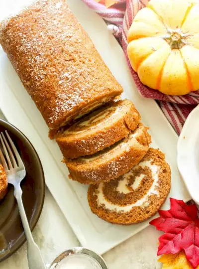 かぼちゃロールよりも古典的なかぼちゃのデザートは何ですか?クリームチーズのフロスティングを巻いたこのしっとりとしたケーキは、心地よく、心地よく、本当においしいです。このロールケーキは意外と簡単に作れます!経由 汚れのない一口