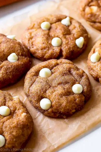 パンプキン スニッカードゥードルは、とても楽しくて居心地の良いスパイスの効いたクッキーです。ホワイトチョコチップの甘みとクリーミーな食感が特徴で、生地はシンプルにまとまっています。経由 サリーのパン作り中毒