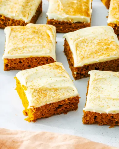 最高のかぼちゃのデザートは何ですか?おそらく、クリームチーズフロスティングのパンプキンバーだと思います。バーは完璧にしっとりしていてケーキのようで、内側にはシナモン、ジンジャー、ナツメグの温かいスパイスがちょうどよく効いています。クリームチーズフロスティングの甘美なクリーミーな層がトッピングされており、一口食べるたびにピリッとした風味が加わります。