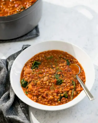 このレンズ豆のスープのレシピはとてもおいしいので、自分の体と地球に良いことをしていることさえ忘れてしまいます。心地よい抱擁に包まれているような気分になります。直火でローストしたトマト、香ばしいフェンネル、ニンニクをフィーチャーしたこのビーガンレンズ豆のスープは、あなたを驚かせる準備ができています。