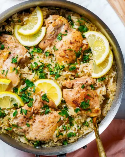この素晴らしいワンポットチキンとライスの食事はまさに 簡単な家族の夕食 あなたの人生に必要なものです。ガーリックとハーブの香りがするご飯や柔らかい鶏もも肉など、心地よくてホッとする味わいです。ピリッとしたパセリレモン グレモラータ 居心地の良い穀物との理想的な新鮮な対照を成します。私たちはこのワンポットミールを友人や家族のために何十回も作りましたが、毎回大好評です(冒険心がない人にも)。