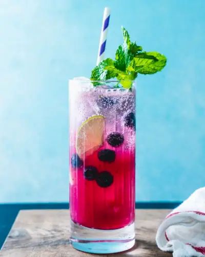 夏に最適なブルーベリー カクテルのエントリーです。このブルーベリー モヒートをお試しください。古典的なものをひねったこのワインはミントのようなフレッシュさがあり、最後にピリッとした甘いベリーの香りが漂います。その魅力的なフレーバーはオリジナルのバージョンをさらに高めたもので、その明るいフクシアパープルの色は誰もが注目するでしょう。ここの新しいお気に入りです!