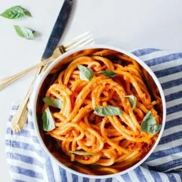 ベジタリアン。グルテンフリーにするには、グルテンフリーのパスタを使用してください。ビーガン、植物ベース、乳製品フリーの場合は、 クリーミービーガンパスタマリナーラ バージョン。