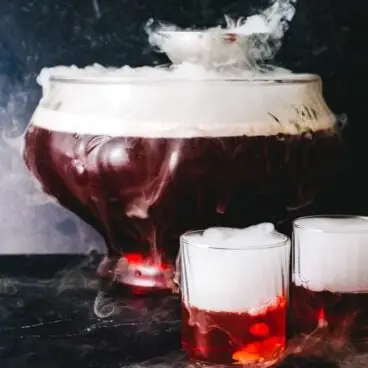 最高に楽しい不気味なドリンクをご紹介します。 ハロウィンパンチ !この血のように赤い大釜は魔法のように泡立ち、沸騰し、部屋中に煙の蔓を放出します。それが印象的でなければ、何が素晴らしいのかわかりません。そのままでは子供向けのフルーティーなハロウィーンパンチですが、熟成ラム酒を加えるとハロウィーンのアルコールパンチに変わります。とても楽しいので、毎月ハロウィーンになればいいのにと思います。そうすればまたハロウィンをやり遂げる口実ができるのに!