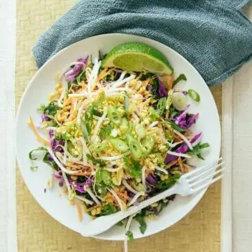 このパッタイサラダは、新鮮な食材を刻んでドレッシングを混ぜるのに少し時間がかかります。しかし、味を考えるとそれだけの価値はあります!同じ名前の麺料理とまったく同じ味ではありませんが、風味と食感は非常に似ています。私たちは大ファンでしたので、皆さんも楽しんでいただければ幸いです!素敵な軽めのランチや、みんなで食べるおかずとしても使えます。