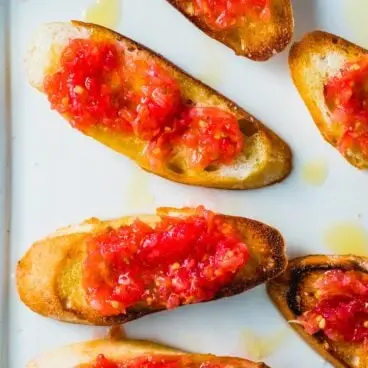 - 仕える: パンが焼き上がったら、ニンニクの切り口でパンをこすりつけます(こうすることで、トーストに大量のニンニクの風味が染み込みます)。トマトの果肉をスプーンで各スライスに乗せます。オリーブオイルを少量かけて、すぐにお召し上がりください。数分経つとパンがべたべたになるので、食べる直前にトマトをトッピングしてください。