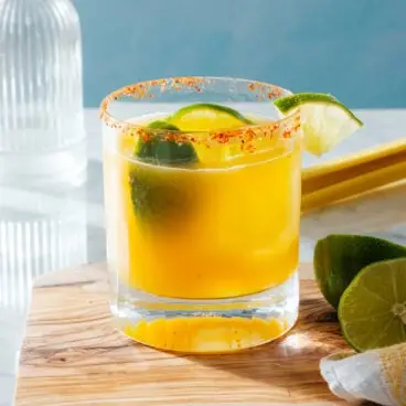 - ライムのウェッジに切り込みを入れ、グラスの縁に沿ってライムを流し込みます。塩とタジン(または塩)を入れた皿に縁の端を浸します。