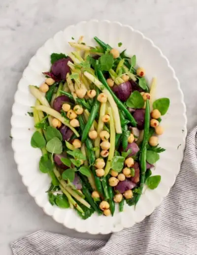 紫芋レシピの最後はサラダです。このサラダは、グリーンビーンズ、ワックスビーンズ、ひよこ豆と紫ジャガイモを混ぜた、栄養価の高いボウルミールです。愛とレモンより