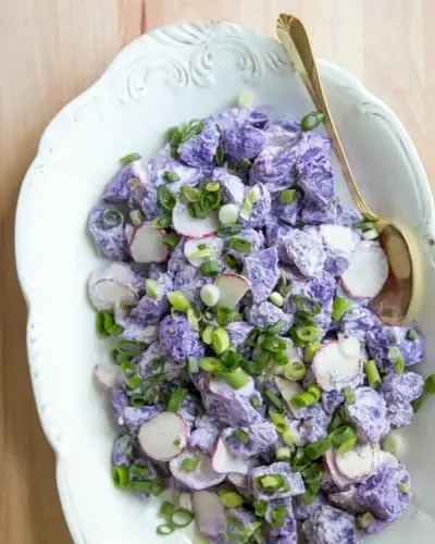 もう一つの完璧な紫芋レシピ、ポテトサラダです。鮮やかな紫色の根菜と、鮮やかなピンク色のピーマン大根と鮮やかなネギを組み合わせて、目を引くサラダを作りましょう。サワークリーム、オリーブオイル、レモンを合わせたシンプルなドレッシングです。
