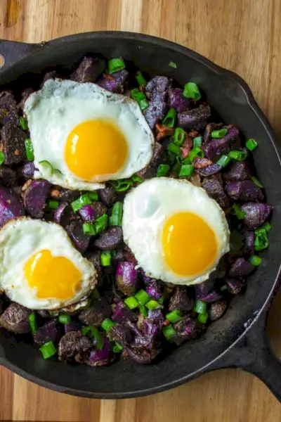 紫芋を食事に変えてみませんか?朝食用スキレットにカリカリポテト、ネギを混ぜ、目玉焼きをトッピングしましょう。朝食や簡単な夕食としても使えます。邪悪な泡立て器経由