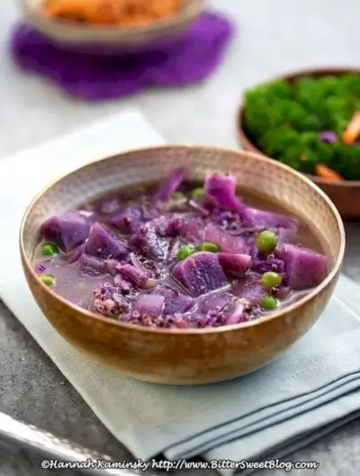 紫じゃがいもはスープによく合いますが、紫キャベツと組み合わせて彩りをさらに鮮やかにしてみてはいかがでしょうか。このおいしいスープには、タンパク質が豊富なキヌアも含まれています。ビーガン アトラス経由