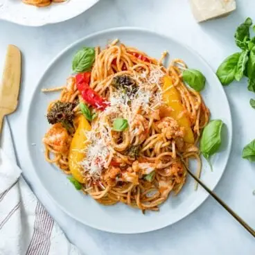この野菜パスタをビーガンとして提供するにはどうすればよいですか?簡単な交換方法が 1 つあります。パルメザン チーズを省略するか、この自家製ビーガン パルメザン チーズを使用してください。カシューナッツ、ガーリックパウダー、ニュートリショナルイーストで作られており、風味がさらに増します。ここでは必須ではありませんが、レシピの質を高めます。