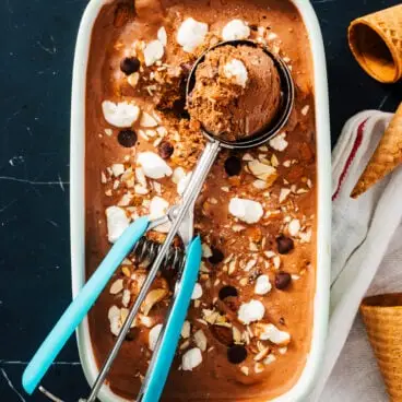 オリジナルのロッキーロードアイスクリームのレシピにはチョコレートチップやチャンクは含まれていませんでした。しかし、私たちにとって、チョコレートは多ければ多いほど良いのです。ロッキーロードの現代バージョンには追加のチョコレートが含まれているものもありますが、オリジナルでは単純にベースとしてチョコレートが使用されていました。好きなものを使ってください(私たちはもう少しチョコレートを我慢できませんでした)。