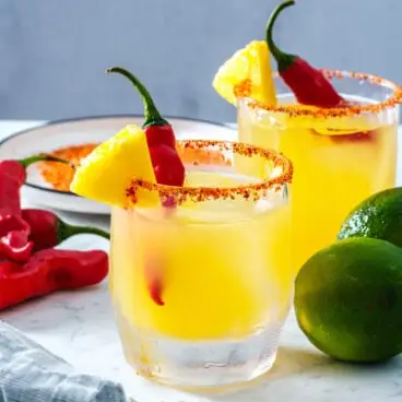 シンプルに使用できます コーシャーソルト スパイシーなパイナップル マルガリータの縁に、甘いフルーティーなフレーバーがアクセントになっています。または、タジンを追加することを検討してください。 タジン は、唐辛子、ライム、塩をブレンドしたメキシコの調味料で、どんな料理にもピリッとしたスパイシーな風味を加えます。楽しいドリンクの付け合わせになります。