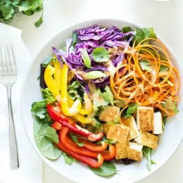 このタイ風サラダは試練に耐えられると思います (そう願っています!)。シャキシャキの野菜と温かくカリカリにソテーした豆腐を、やみつきになるクリーミーなピーナッツソースのドレッシングで和え、ピーナッツ、コリアンダー、ライムをトッピングします。豆腐が苦手な方は、鶏肉のソテー、エビのソテー、または豆腐の代わりに使ってみてください。 茹でて殻をむいた枝豆 プロテインのために。現状では、このタイ風サラダはグルテンフリー、ビーガン、乳製品を含まないため、さまざまな食事にも適しています。サラダの味や食感が多様で興味深くなればなるほど、満足感が増すため、このボウルにはたくさんのものが入っています(読んでください:私にとって、夕食後の間食の誘惑が減りました!)。