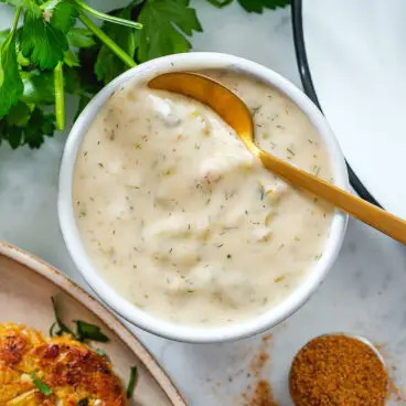 このビーガン タルタル ソースのレシピでは、ケッパー、ディル、ビーガン マヨネーズを使用して、クリーミーで風味豊かなディップを作ります。ビーガン フィッシュ アンド チップス、クラブ ケーキ、ベジ バーガー、またはキャロット スティックをディップするのに最適で、古典的なものに植物ベースのひねりを加えたこのレシピは誰もが大好きです。